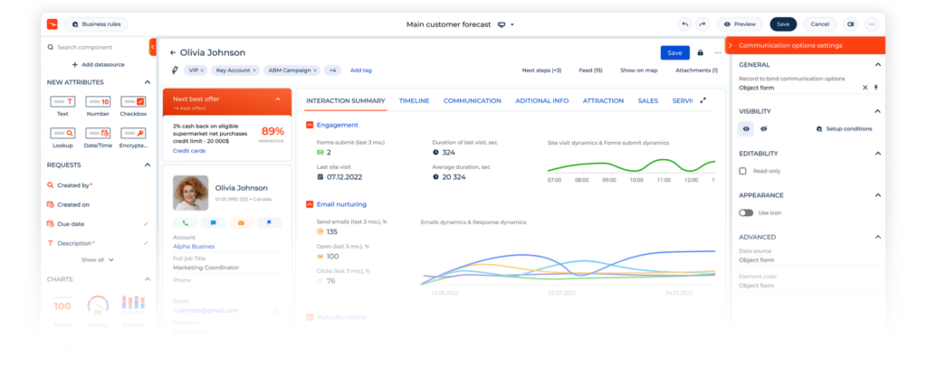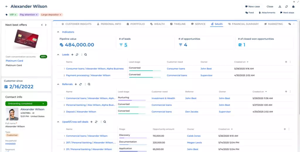 Predefiniowane procesy biznesowe wspierają każdy etap relacji z klientami w bankowości – od marketingu i onboardingu, przez sprzedaż, aż po obsługę posprzedażową i kontakt z centrum wsparcia.